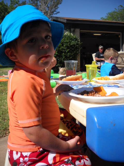 Saturday we went to Payton’s 3rd birthday party! Payton is the sitter’s daughter who calls Monks Ache-uh-men. It was a luau theme and you had to wear your water gear! I had the best time seeing Monks interact with all the kids. These are the kids he is with daily and his “friends” and the only time I see them together is the few minutes I am there dropping him off or picking him up. They had some slip n slides, a small pool with water, water balloons and one of those hoses that has little sprayers that shoot back and forth and wiggle around. He had so much fun in the water. He looked so cute in his swimming trunks and water shirt and he was the only one in a hat. A little girl handed out lei’s to everyone and they would put them around their neck. Monks had his across his body and under his arm. It was like a little the thing Chewbacca wears lol They grilled hot dogs and he sat at the little table eating his hot dog, beans and chips while the other kids were up and down and in and out of the water. Monkey likes his food, what can I say. They then brought out cupcakes and pink doughnuts! Everyone sang and then we got him a blue cupcake. He sucked on the top forever and left the very bottom cake part. His whole mouth was blue and looked like he had a little beard and mustache. Then it was back to the water! After she opened her presents (Monks bought her a baby doll) we changed him in the back of the Tahoe and then went to say our goodbyes. He received a goodie bag with crackers, cookies, a lei, and some green star shaped sunglasses. We joked he looked like Elton John in them and he loved them! I know there are several pics but look at him, I could not narrow it down!